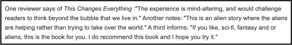 Intrigued by multiple timelines, aliens, psi skills, romance and planetary change? Clara and the alien “Band” are back in Volume II, This Changes My Family and My Life Forever.