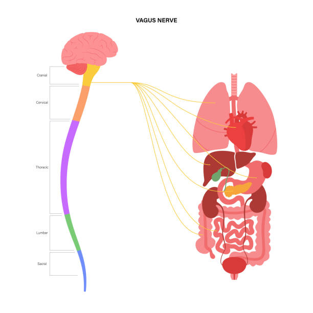 Vagus nerve diagram. Parasympathetic and central nervous system function. Signals from brain to internal organs in the human body. Spinal cord and nerves connections flat medical vector illustration. From: https://www.istockphoto.com/photos/vagus-nerve
