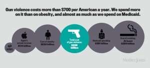 So: charge each Congressional Rep a FINE if s/he votes AGAINST gun safety, gun control, gun laws OF ANY KIND another 10% of the total costs, above, AND use these fines to cover FUTURE gun violence costs, such as extra policing, compensation to families of victims, compensation for employers/workplaces of victims, funds for repairs to venues where shootings occurred, compensations to property owners/users of sites where shootings occurred, compensation to neighborhoods in which decreasing property values occur because of being the sites or being NEAR the sites of gun violence, etc.